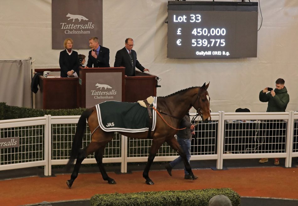 An opening bid of £100,000 signaled the popularity of Gallyhill (Getaway) at Friday’s Tattersalls Cheltenham Sale and after a battle of bids, the bay was confirmed the top lot at £450,000.